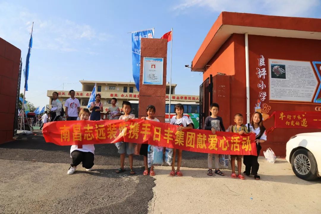孩子们举着写着南昌志远装饰集团携手日丰集团献爱心活动的横幅欢迎这群可爱的人到来!
