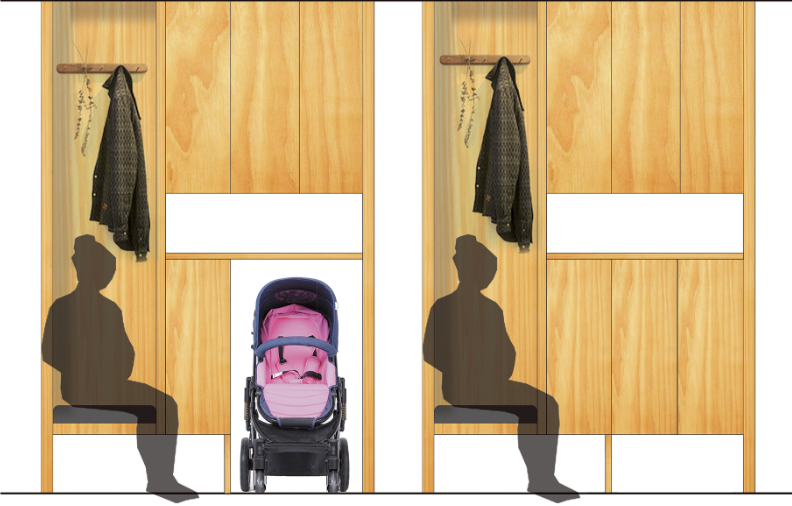 2.宝贝的交通工具收纳在鞋柜活动空间内,不管是出门还是回家都很方便