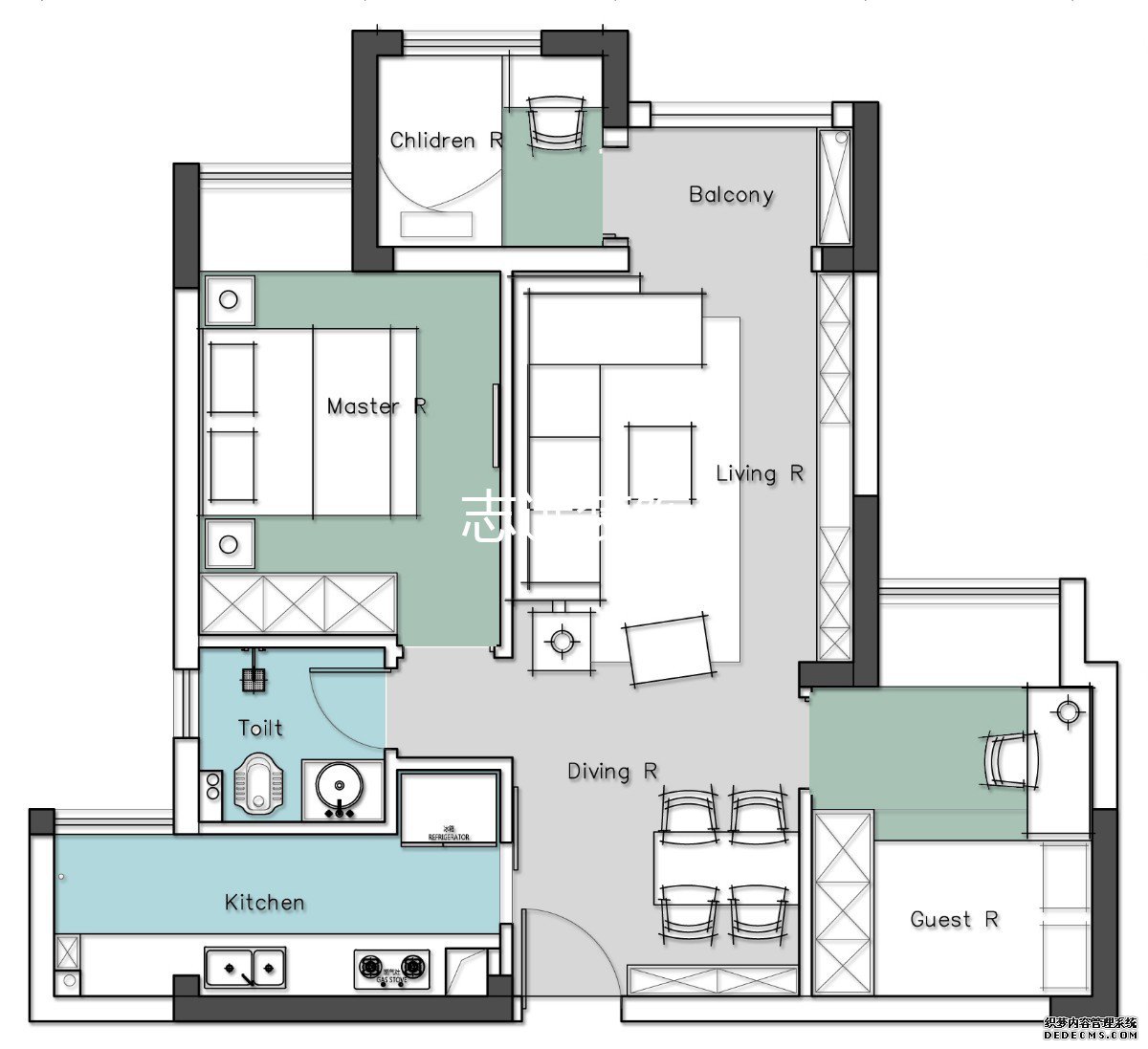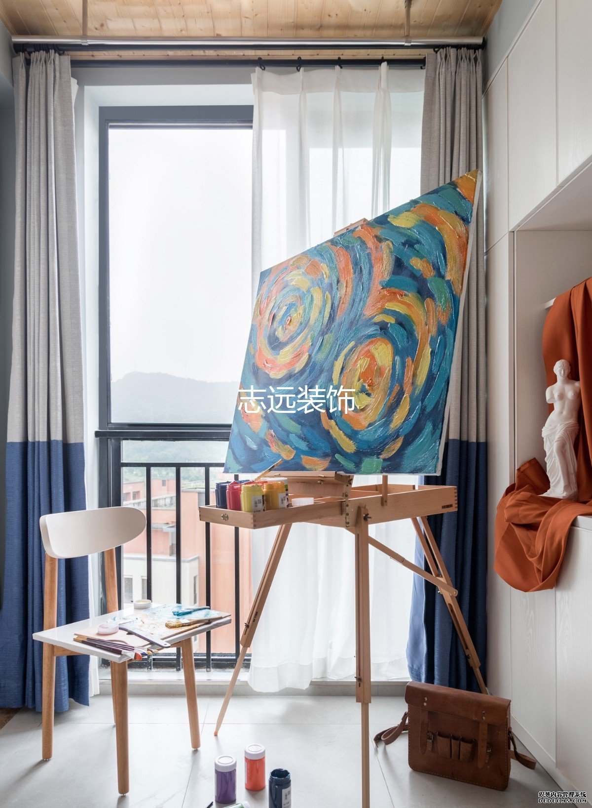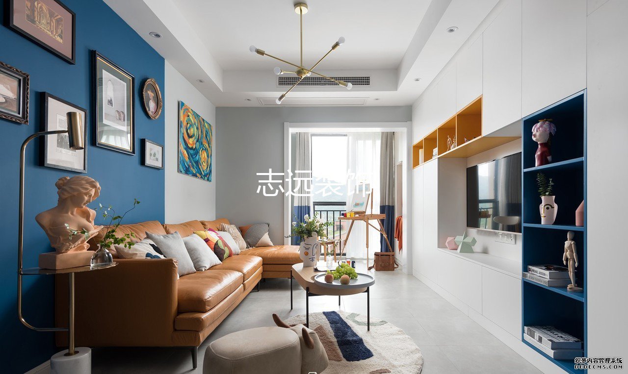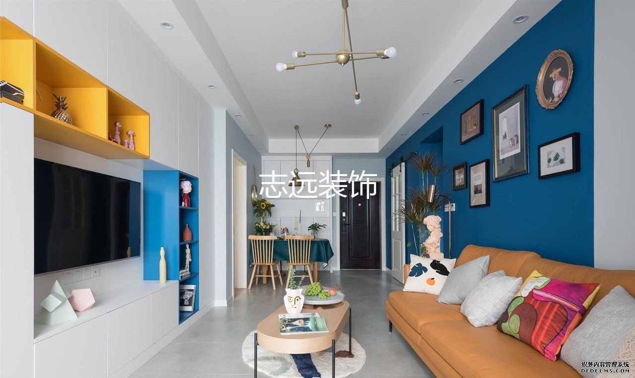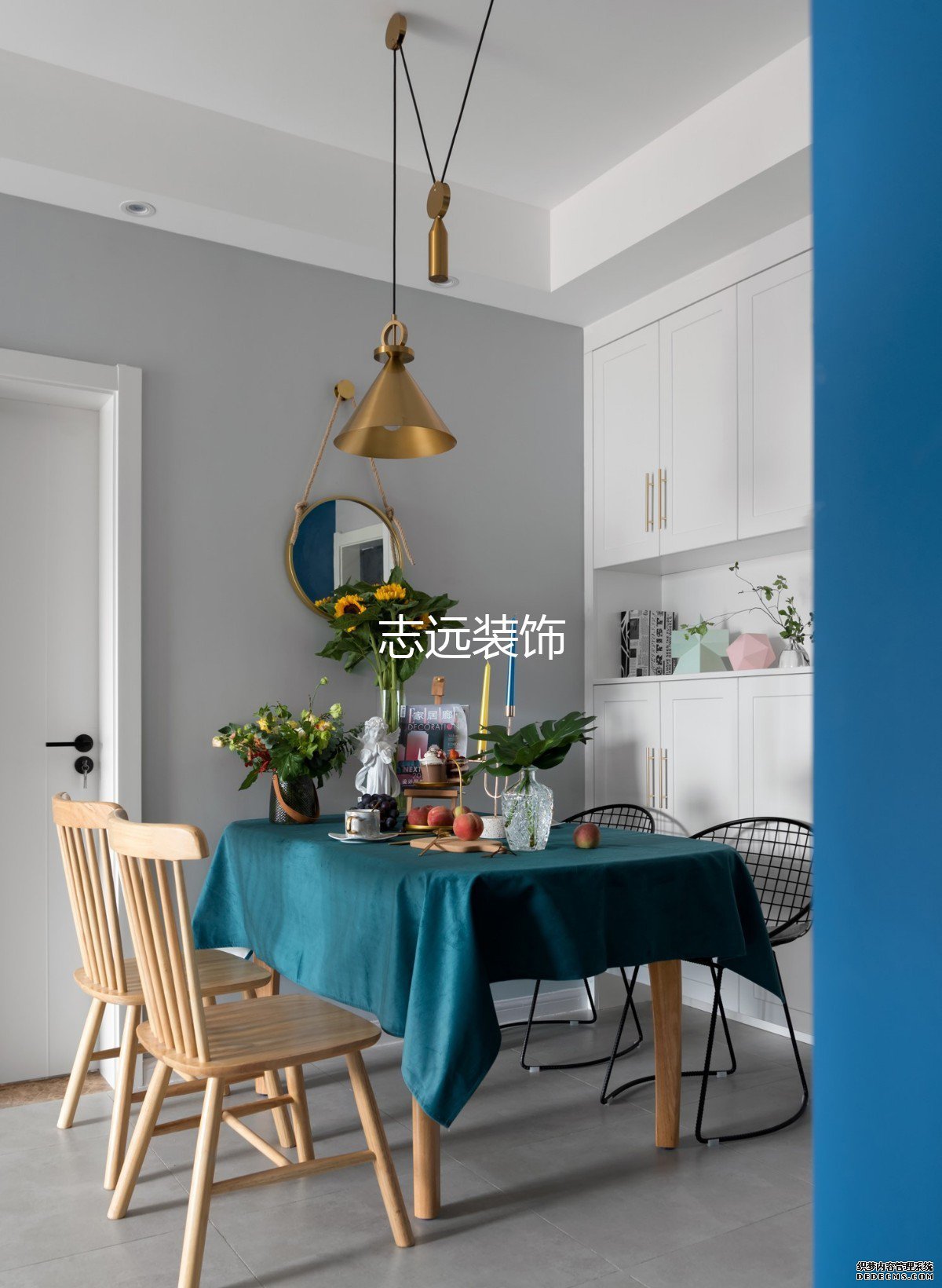 客厅为了实现复古的效果,原设计是做了上下墙,上墙灰色,下墙蓝色,但是女业主觉得和她农村老家的90年代的装修很像,于是调整了蓝色的区域。调整后的蓝色区域从沙发墙三分之二处断开,视觉上让客厅有了延伸性。本来不大的客厅因为这样的小心思再搭配复古的家具,显得精致又有格调。由于没有单独的玄关,所以餐厅部分选择了可以伸缩的桌子,平时收起来让进门的地方更宽敞。打开后可以满足多人用餐的需求。