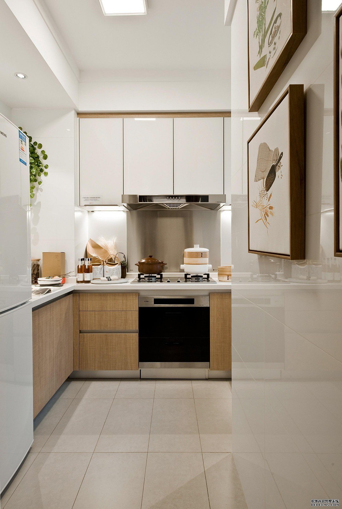厨房虽然不大,但是也可以摒弃传统的扣板吊顶,这样是不是更简洁大方有质感,配以白色的墙砖和门板