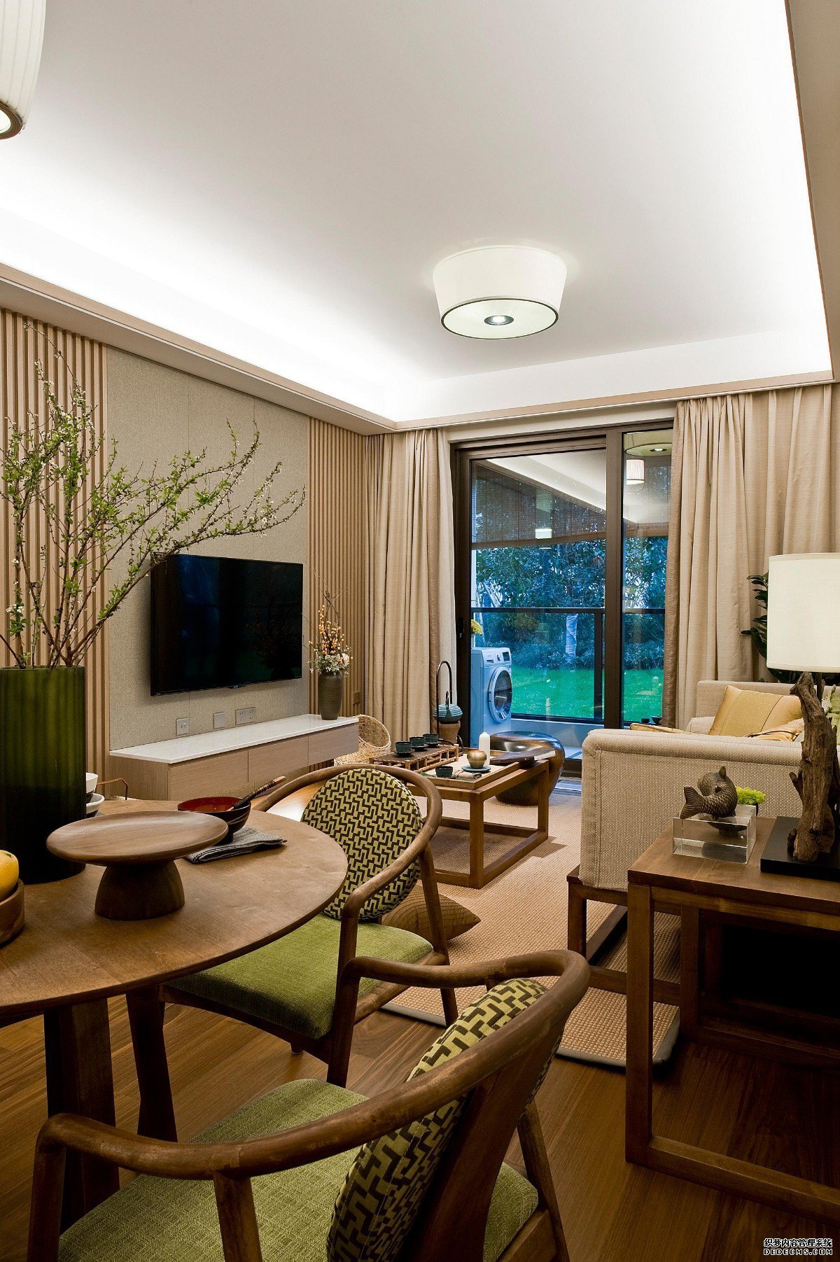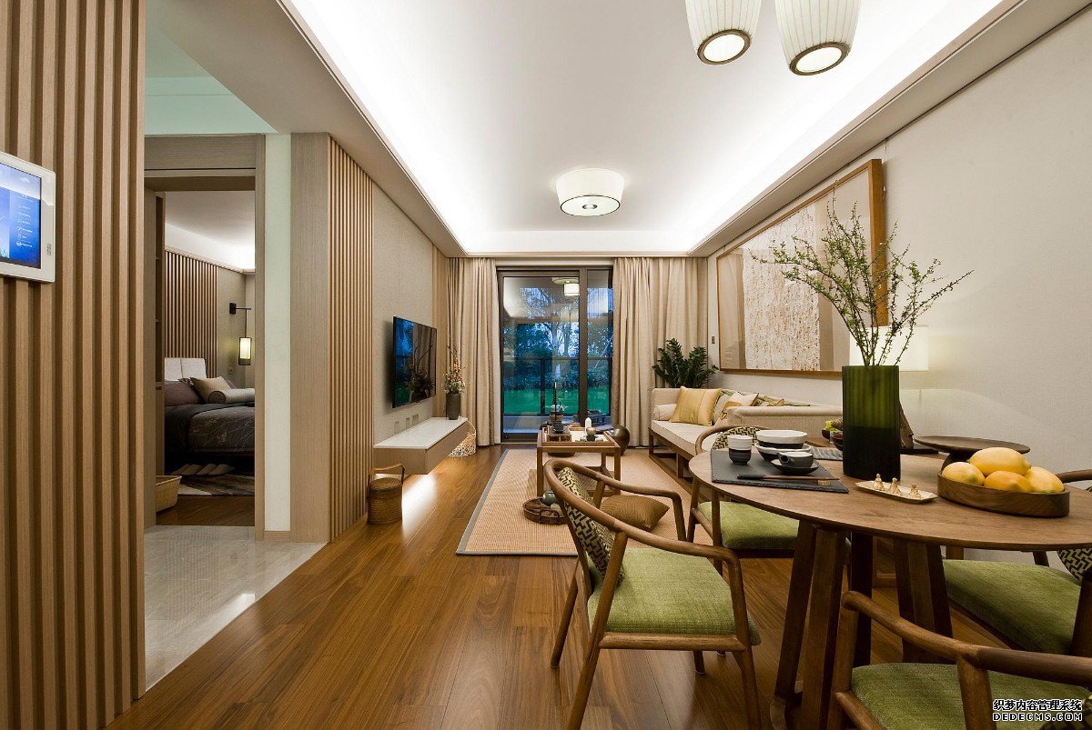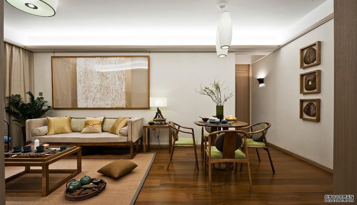 原木的桌子和沙发配上实木地板,让你感觉到生活的高品质