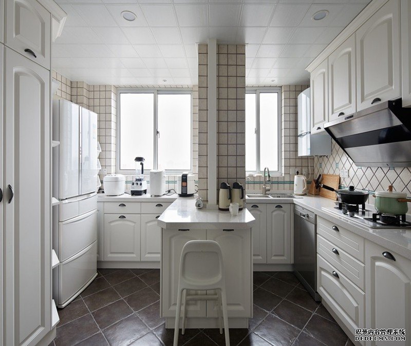 厨房空间:开放性的厨房,充满怀旧感的墙砖,凸显着美式风格自由,富有历史气息的鲜明个性。与厨房设计色彩相一致的休闲小吧台,既是厨房的延伸又是厨房与外部空间的分界线,空间格局鲜明。