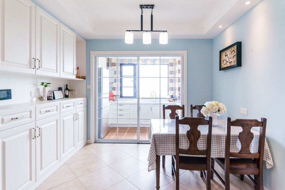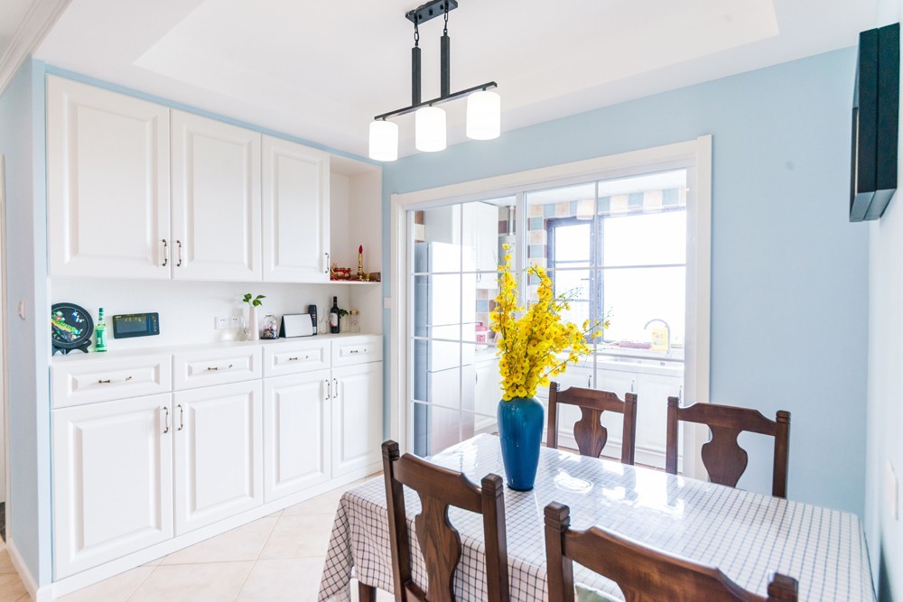 餐厅窗子的位置,使空间更加明亮而且显得空间更大。白色的柜子,浅色的瓷砖让房间变得更加整洁。