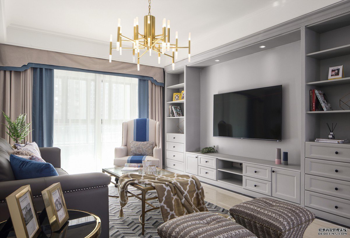 灰色的护墙板和兼具储物柜功能的电视背景墙搭配金色的家具,低调与奢华相互平衡,带来别样的美式感受。